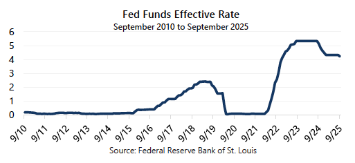 As of October 14, 2025, the Fed Funds Futures curve shows the market pricing in further interest rate cuts over the next 12-months with an implied policy rate settling near 3% by September 2026. A reduction, but in line with the Fed Funds average since 1990 of 2.87% (and still well beyond the post-Global Financial Crisis average of 1.29%).