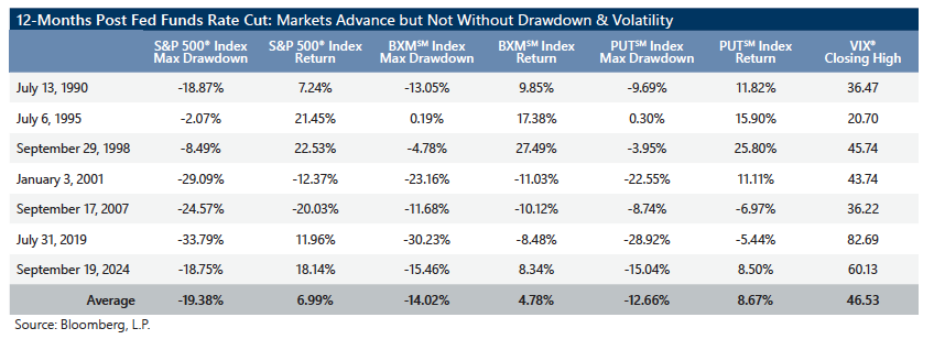 - Following an initial rate cut, the average 12-month return of the BXMSM and PUTSM was 4.78% and 8.67%, respectively.