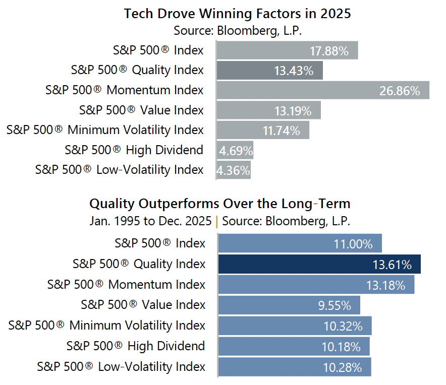 During 2025, the S&P 500® Quality Index returned 13.43%. As some may expect, quality underperformed both growth and momentum in 2025 as spending on AI-powered technology names higher. In 2025, the S&P 500® Momentum Index and the S&P 500® Growth Index returned 26.86% and 22.18%, respectively. With technology firms at such a high concentration in the S&P 500® Index, quality also underperformed the broad market return of 17.88% in 2025.