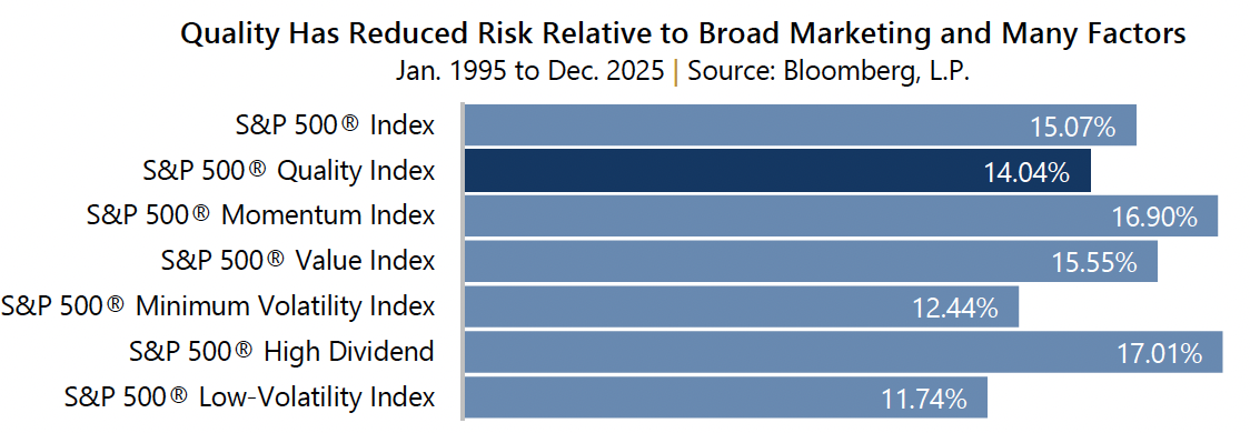Data shows that during the period of January 1995 to December 2025, quality equities not only outperformed the broad market but also most well-known factors. It did so with less risk than most – the low-volatility factor provided the lowest level of risk, followed by min-vol, as one might expect. The quality factor provided the highest Sharpe ratio and level of alpha compared to the S&P 500® Index during the period while capturing about 97% of the market upside compared to 80% of its downside.